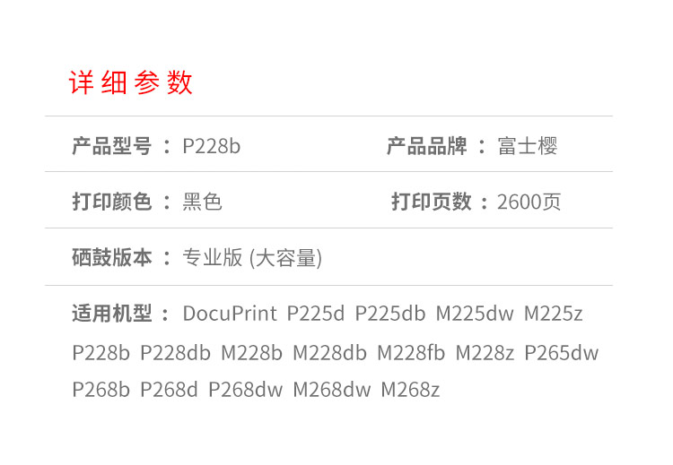 商品名稱:富士櫻 P228b墨粉盒 適用施樂P228b/db M228b/db/fb/z P225d/db M225dw/z P265dw P268b M268z打印機CT202332
